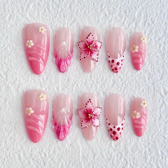 This set is sweet, flirty, and fresh — with blooming hibiscus-style florals, tiny white daisies, delicate swirl textures, and playful pink polka dots. It feels like a soft spring breeze wrapped in petals and candy.