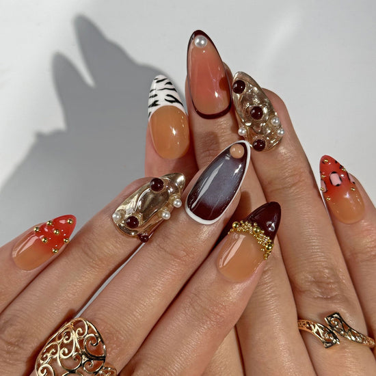 This set is daring, luxurious, and full of texture — blending caramel and mocha tones with zebra stripes, pearl accents, gold foil, molten chrome, and gem clusters. It’s high fashion meets abstract art with a fierce edge.