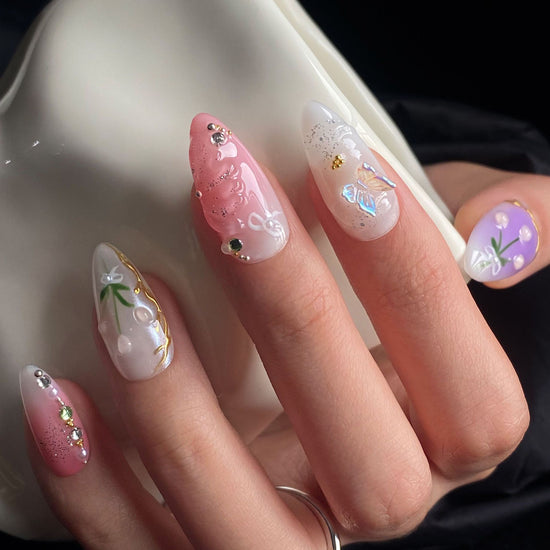 This set is soft, feminine, and whimsical — featuring pastel pink, lilac, and white bases adorned with dainty cherries, butterflies, florals, gold foil, and crystal accents. It radiates playful elegance with a dreamy springtime charm.