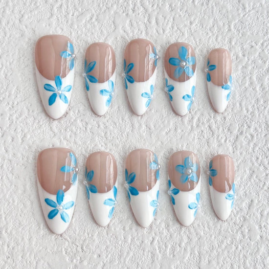 This set is fresh, cheerful, and perfect for spring or summer — with white tips, bright blue 3D flowers, and delicate pearls on a clean nude base.