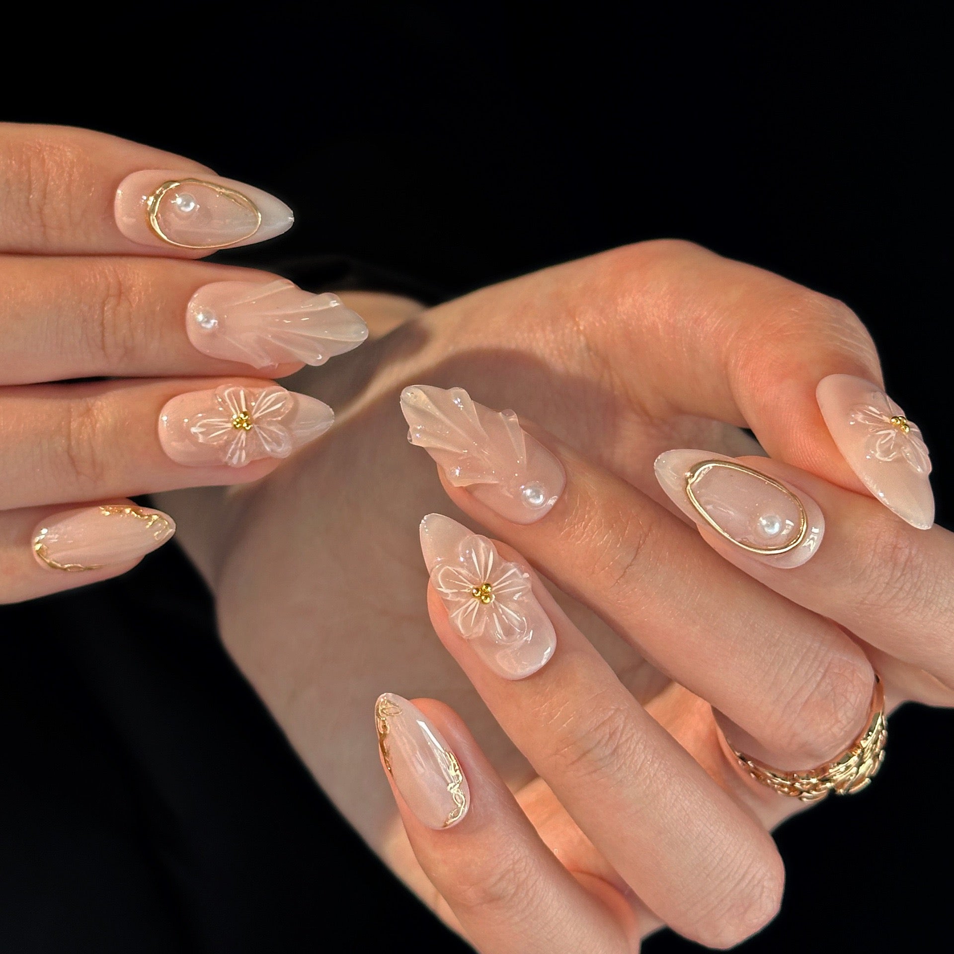 This set is ethereal, bridal, and luxuriously delicate — featuring soft sheer nudes, glassy 3D petals, gold wire detailing, and pearl accents. It’s the embodiment of elegance, perfect for weddings or timeless glam.