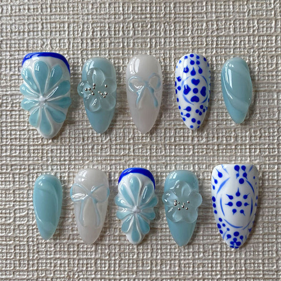 This set features a dreamy blend of icy blues, porcelain-like patterns, and sculpted flowers — very serene and elegant.