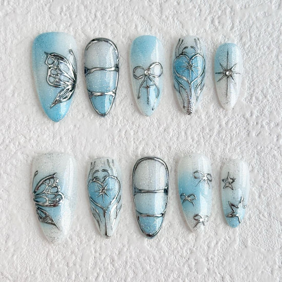This set has a dreamy, edgy vibe — cool pastel blues with fine black sketch-style line art featuring butterflies, hearts, bows, and celestial details. It feels both delicate and artistic, like hand-drawn tattoos on frosted glass.