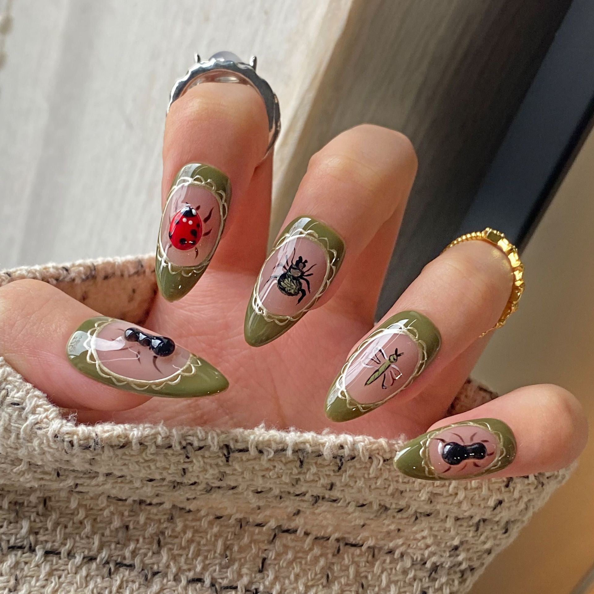 This set is quirky, earthy, and delightfully unexpected — featuring hand-painted bugs like a ladybug, ant, dragonfly, and beetle framed by green French tips and delicate white lace details. It’s nature-inspired with a whimsical, collector’s twist.