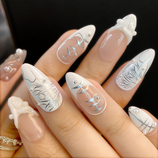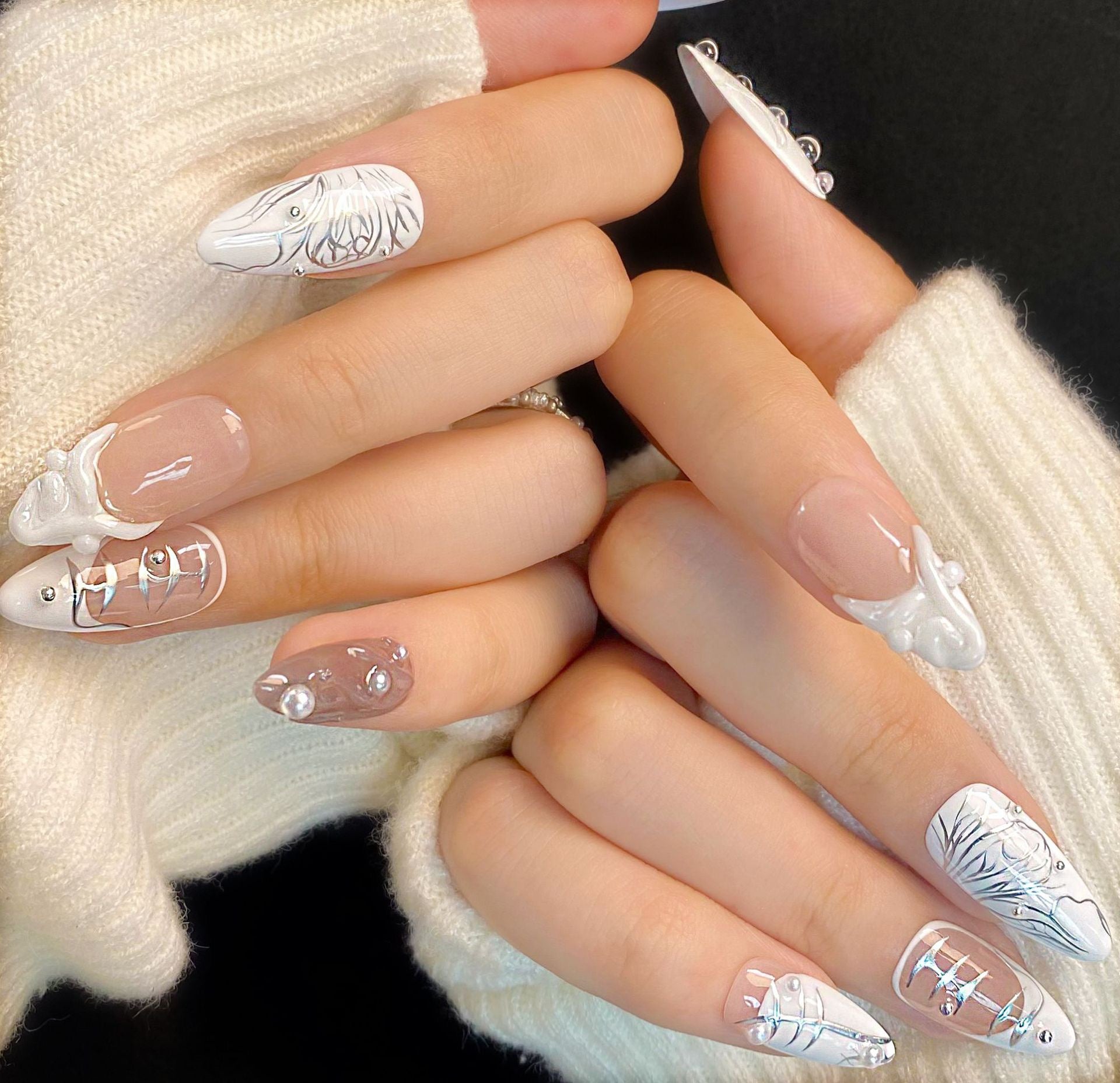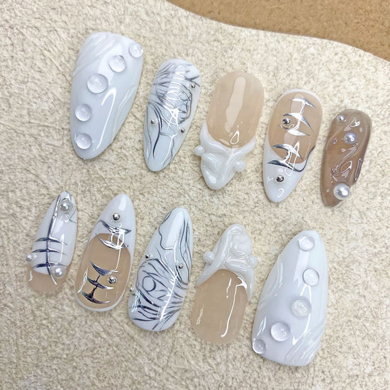 This set has a modern, edgy, and abstract vibe — with monochrome sketch lines, pearl accents, and water droplet textures. It’s artistic and fashion-forward.