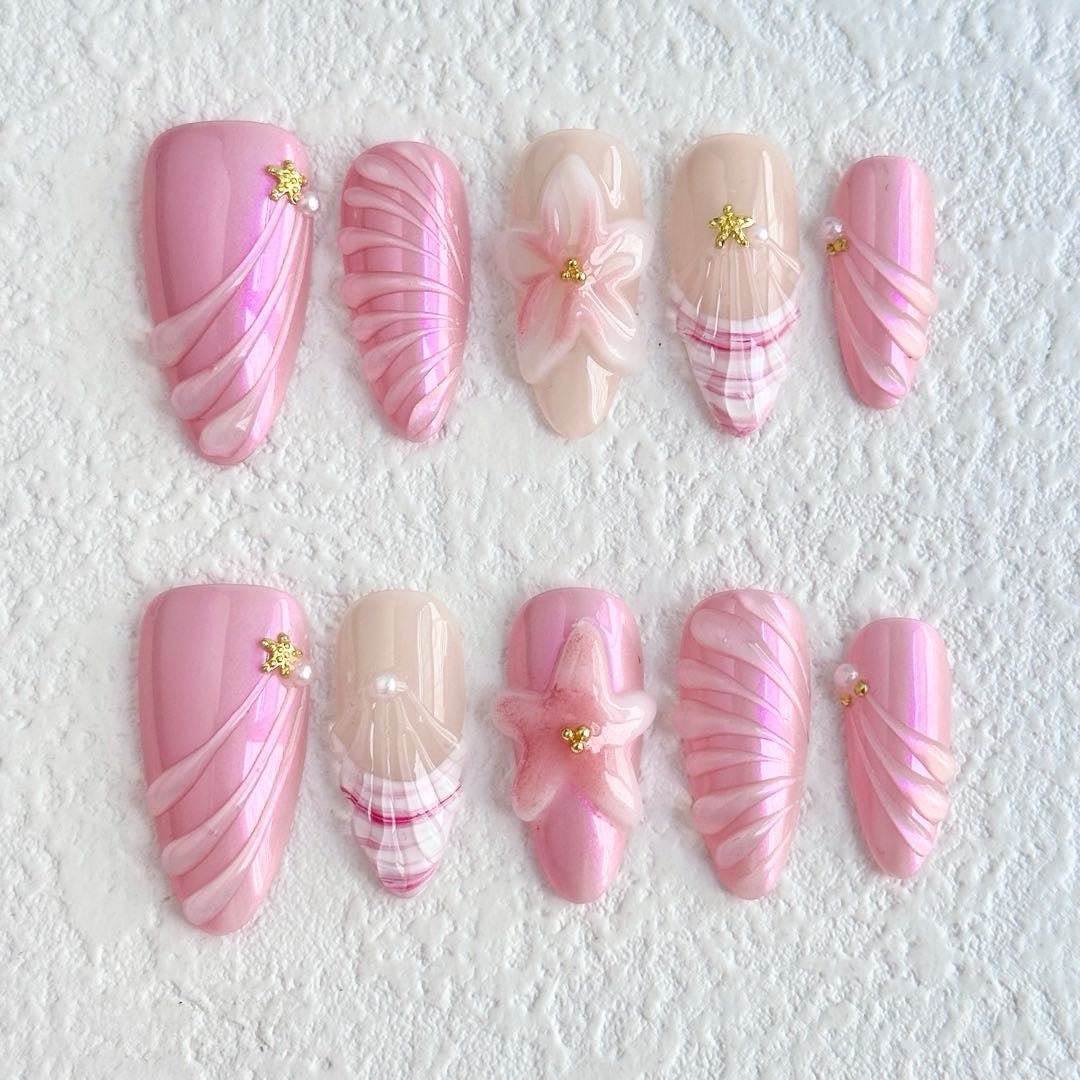 This set is soft, romantic, and delicate — featuring flowing shell-like curves in pastel pinks, layered with gentle shimmer and finished with floral accents and golden gems.