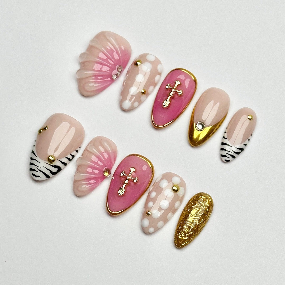 This set is bold and eclectic — a dramatic mix of zebra stripes, gold chrome, crosses, pearls, shells, and polka dots in shades of blush, hot pink, and nude.