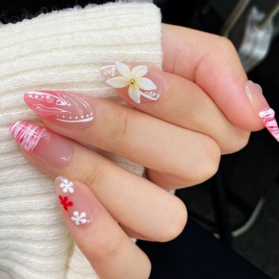 This set is soft, sweet, and full of youthful charm — featuring delicate white linework, swirls, abstract florals, and a standout 3D plumeria. The palette of sheer pinks with red and white pops adds a playful and elegant balance.