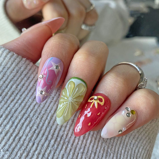 This set is bright, bold, and playful — combining a gradient candy swirl, 3D citrus slice, strawberry-inspired red with a yellow bow, and gem-studded accents. It’s giving sweet, fruity, and fun, with a touch of fantasy.